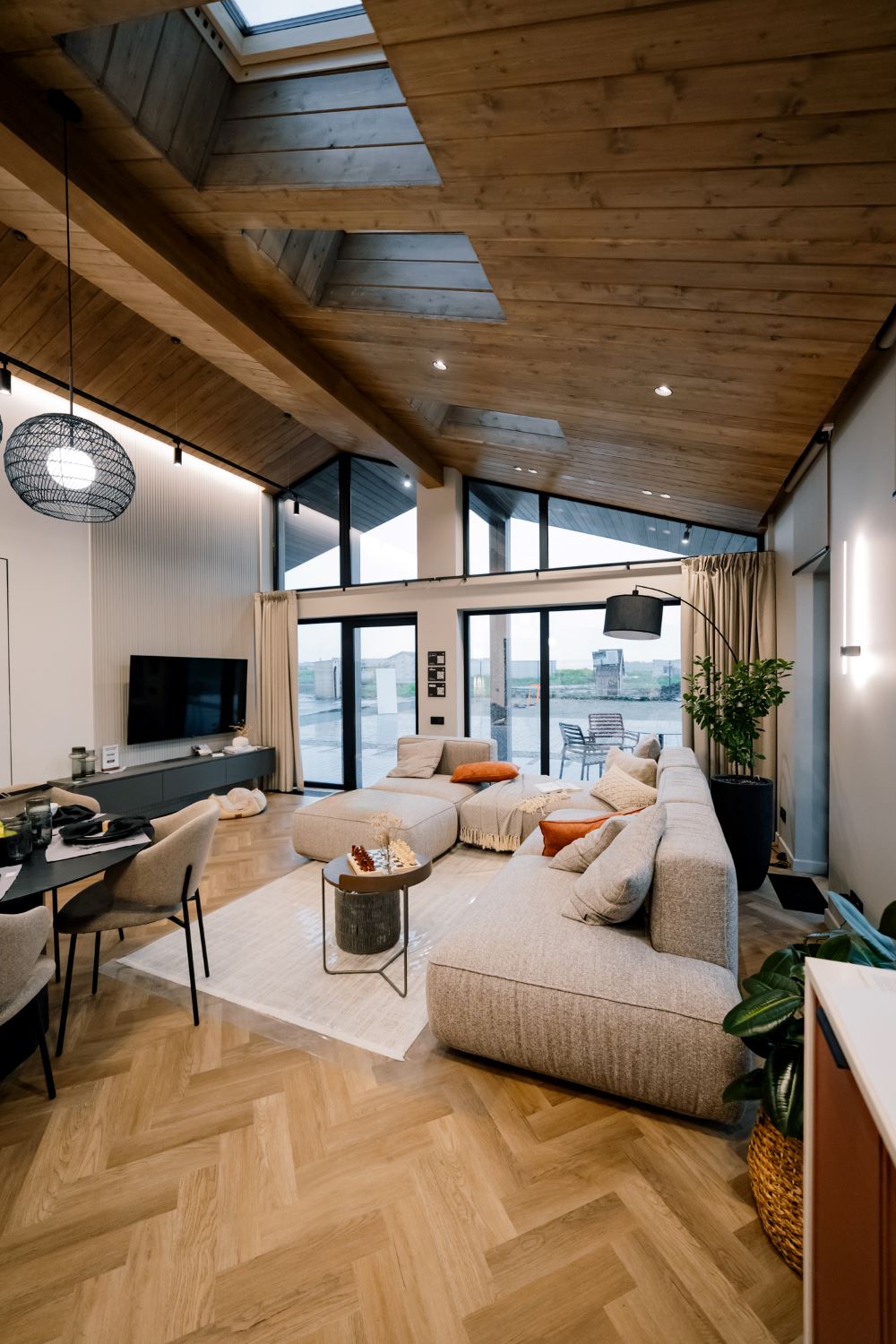 В активной зоне кварцевый ламинат уложен единым полотном, он подчёркивает целостность пространства и создает ощущение порядка. Это современный дом с качественными материалами, где комфорт чувствуется сразу — без лишних объяснений.